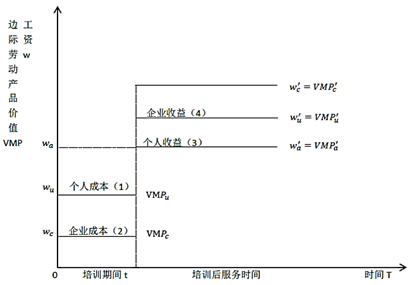 显然,采用第一条途径存在着一些困难,它限制了依据生产经营情况对劳动雇佣量调整的灵活性,而且还要受到种种制度性因素的干扰。第二条途径是可行的,即在培训期间,企业和员工双方承担培训成本,在雇用期间劳动关系双方获得预期培训收益。