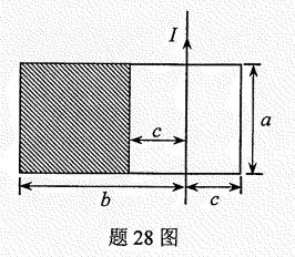一长直导线通有电流I=I0sinωt,与矩形导线框共面放置,彼此绝缘,线框尺寸如图所示,其中b=3/2a,c=1/2a。求:(1)线框阴影区域内磁通量的大小;(2)直导线与线框的