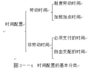 时间配置的基本分类为:劳动时间是指劳动者从事有酬性社会劳动所花费的时间;非劳动时间是指劳动者从事无报酬社会劳动耗费的时间。其基本分类如图3——4所示。