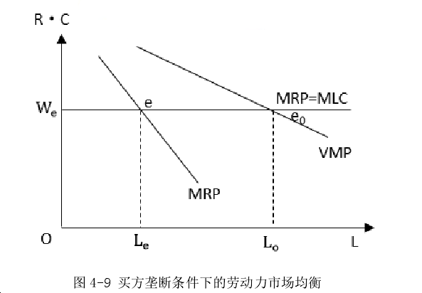 在竞争性劳动力市场上,劳动力供给曲线 ALC 与 MLC 是同一条曲线,它实际上是平行于横轴的一条直线。根据企业利润最大化的原则 MRP = MLC ,均衡点就是图中的 E 点,此时,工资率为 WE ,就业量为LE 。然而,在产品市场上,由于垄断使得产品市场上存在过剩的生产能力,厂商的产量会下降,导致降低劳动力的雇用数量,从而影响了劳动力市场的就业水平,即劳动力市场上会出现多余的劳动力。