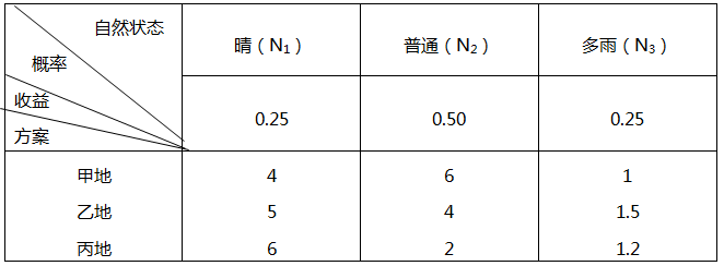 某公司为了扩大市场,要举行一个展销会,会址打算选择甲、乙、丙三地,获利情况除了与会址有关系外,还与天气有关,天气可分为晴、普通、多雨三种(分别以N1,N2,N3)。通过天气预报,估计3种天气情况可能发生的概率为0.25,0.50,0.25。其收益情况如表: