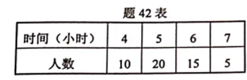 (2)大班50位幼儿在家阅读时间见题42表:这50位幼儿一周平均在家阅读时间是多少? (写出计算过程,结果精确到