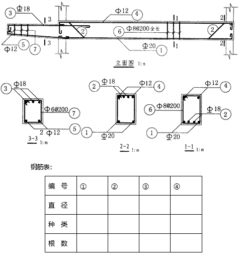 根据钢筋混凝土梁的结构图,填写钢筋表。
