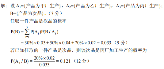 海尚公司的某种产品由三个分厂分别加工生产,其中甲厂的产品占产品总数的30%,乙厂占50%,其余的是丙厂加工生产的。又知甲、乙、丙三厂在加工生产该产品时出现次品的概率分别为0.03,0.04,0.02。现从所有产品中抽取一件产品进行检验。试计算若已知任取的一件产品是次品,则该次品是丙厂加工生产的概率。