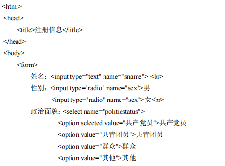 使用HTML语言创建如下的表单页面,使之在浏览器中显示效果如图所示,其中文档标题为“注册信息”。提交按钮不要求事件处理。